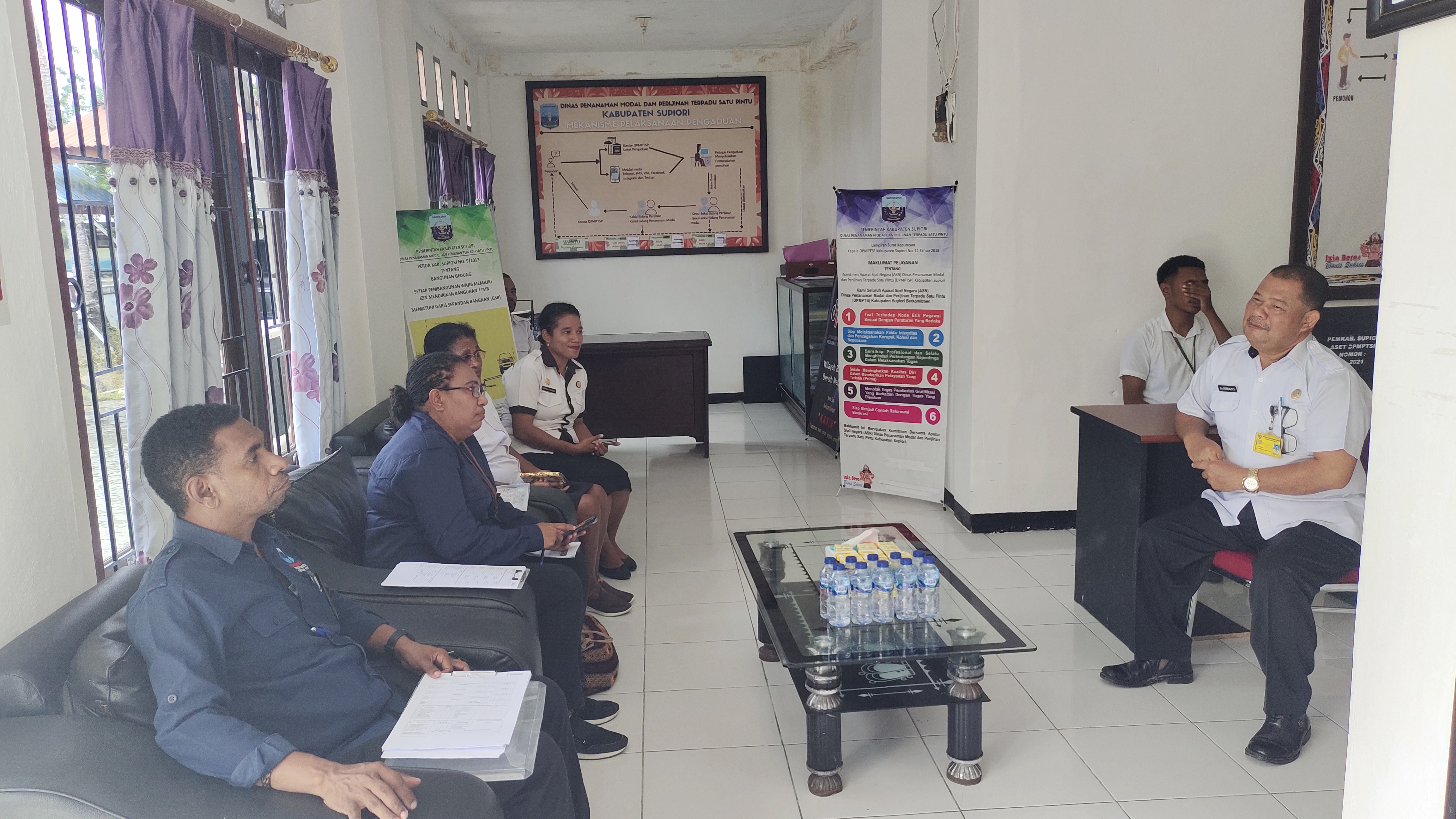 Sorendiweri - Kepala Dinas Penanaman Modal dan Perijinan Terpadu Satu Pintu (DPMPTSP) Kabupaten Supiori Drs. MARWAN, M.Si, menerima langsung kunjungan tim Ombudsman RI Perwakilan Provinsi Papua yang diketuai oleh Ibu Melania Pasifika Kirihio, SH, MH, maksud kunjungan tersebut dalam rangka melakukan penilaian penyelenggaraan pelayanan publik, standar pelayanan pengaduan dan perizinan tahun 2024. Yang mana kunjungan tersebut berlangsung di kantor DPMPTSP Kabupaten Supiori pada hari Rabu, 12 Juni 2024.